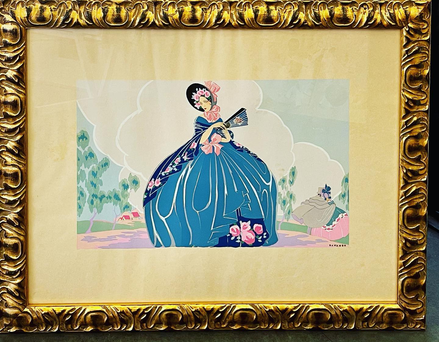 Pochoir su carta di gusto liberty alla maniera di Brunelleschi , firmata in basso a destra, prima metà del 1900 più cornice legno dorata moderna.