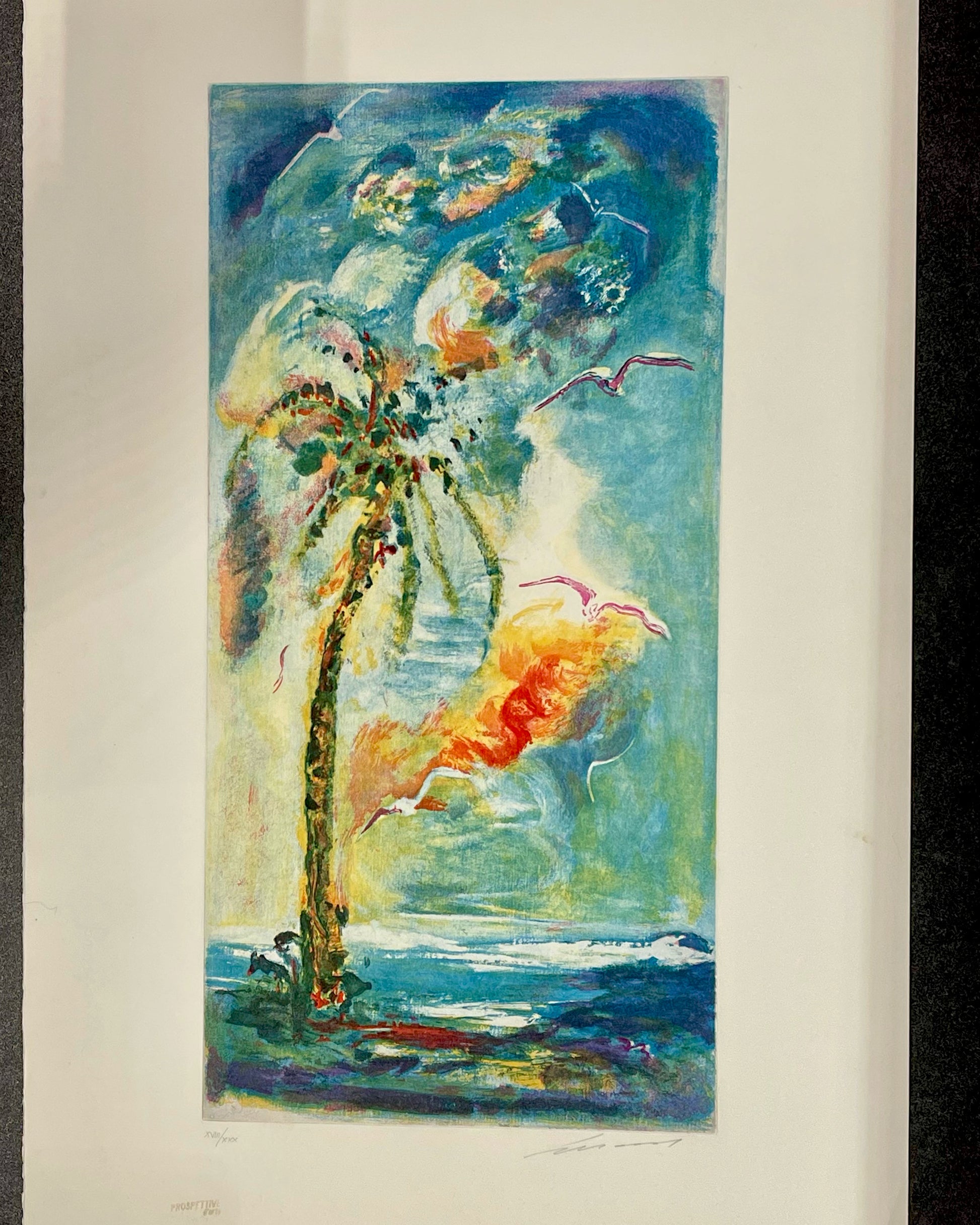 Ernesto Treccani. Palma a Nizza. Acquaforte a 8 colori. Esemplare N° XVIII/XXX. Numerata e firmata a mano. Timbro a secco editore in basso.