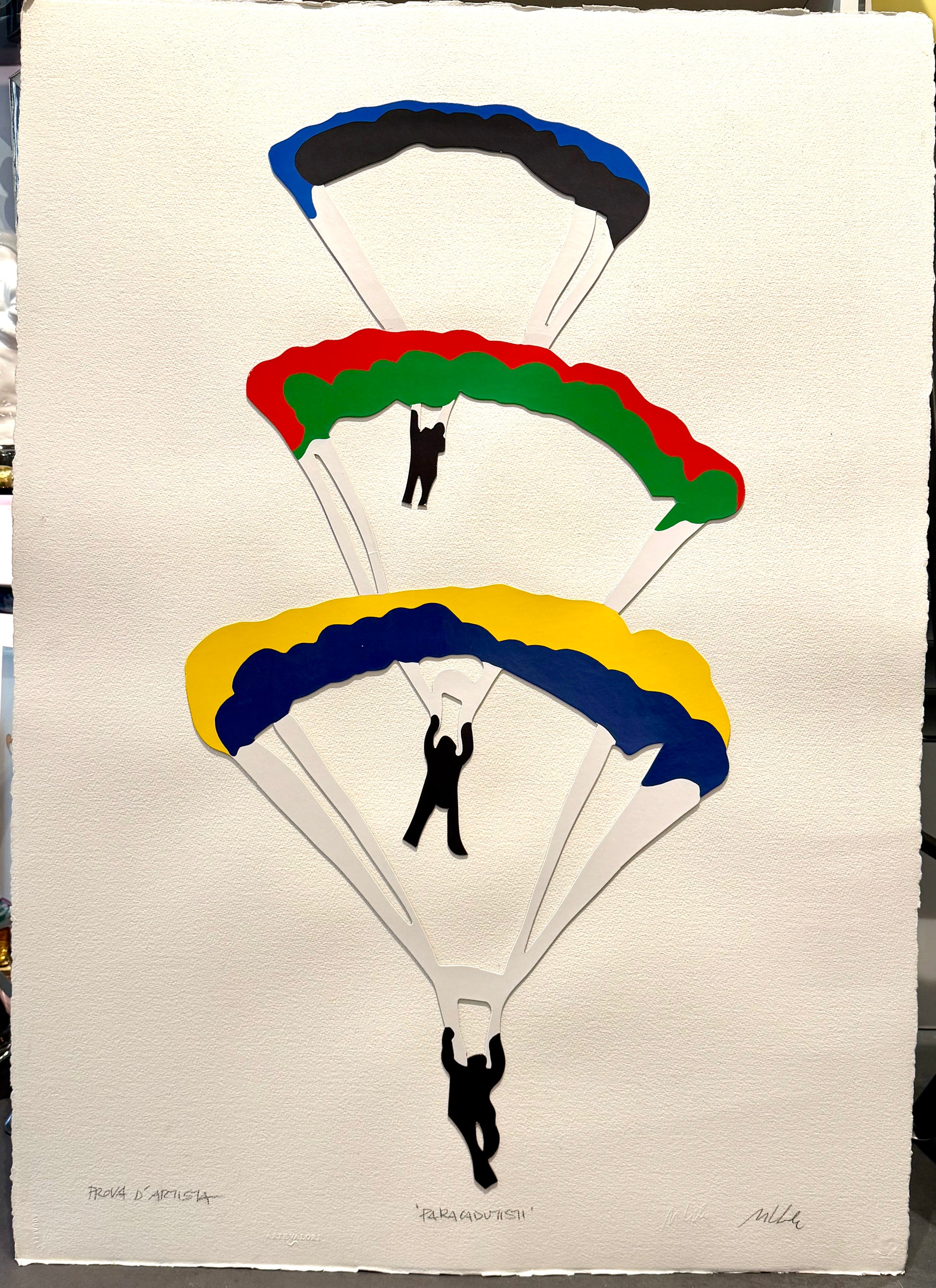 Marco Lodola. Paracadutisti. Serigrafia con inserti applicati su foglio “aquarelle Arches” Esemplare prova d’artista. Firmata e titolata a mano più timbro a secco firma , timbro a secco in basso “arte valore”. Tipica dello stile luminoso e pop dell’artista. Misura foglio: cm.105,5 x 75. Anni 90. Esemplare in perfetto stato carta con barbe. Rara.